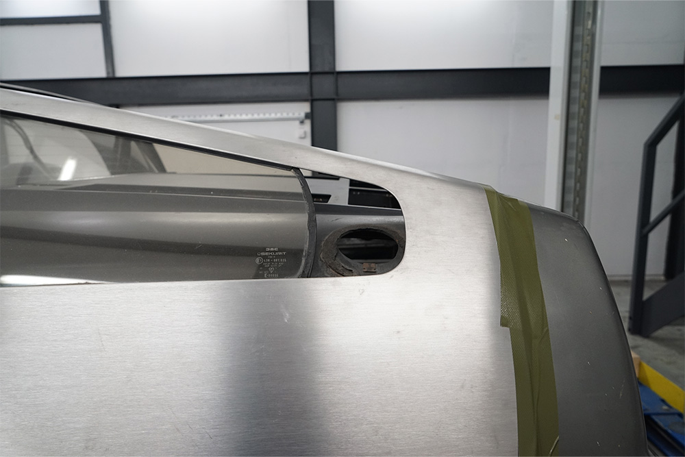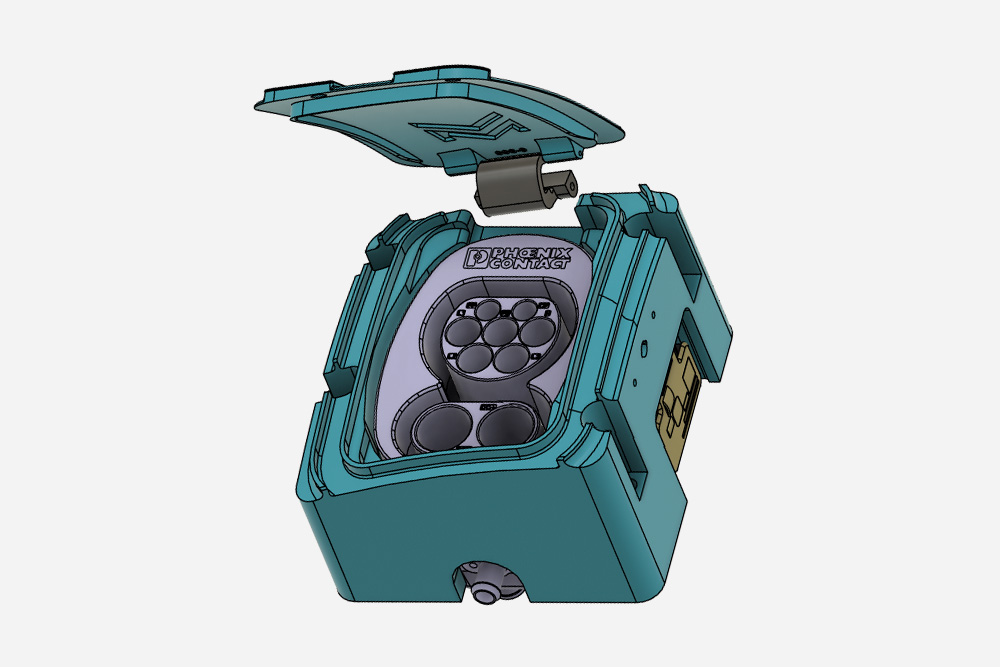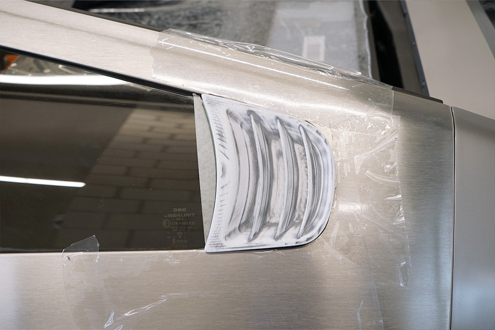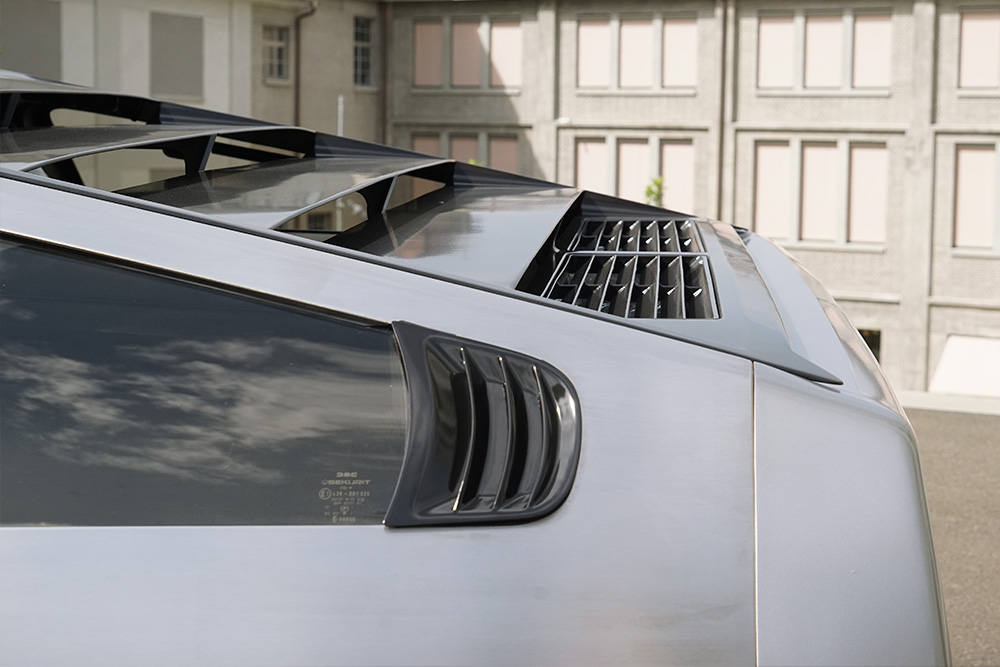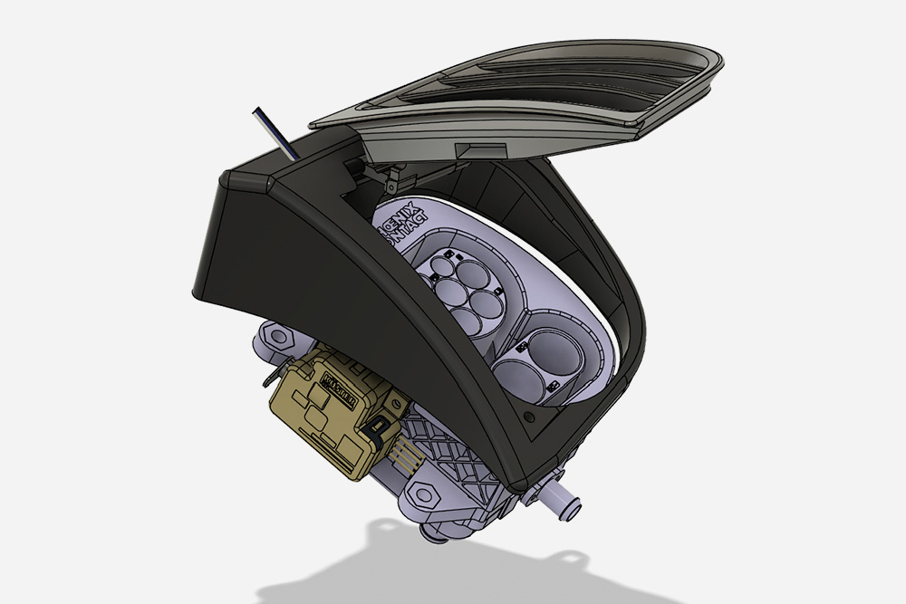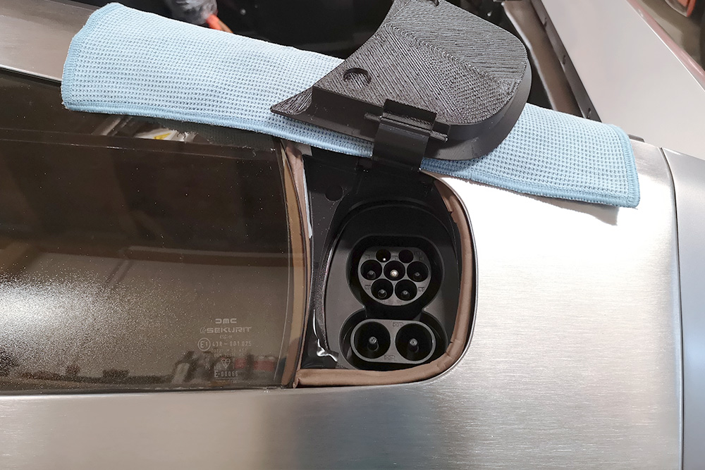 Beim DeLorean konnten wir die Tankklappe dort unterbringen, wo früher ein Lufteinlass für den Kühler war. Ein wenig Glück war da auch dabei, denn eine CCS-Dose und der zugehörige Stecker brauchen doch etwas Platz. Damit sich das überhaupt so realisieren liess, musste ein möglichst platzsparendes Scharnier konstruiert werden.