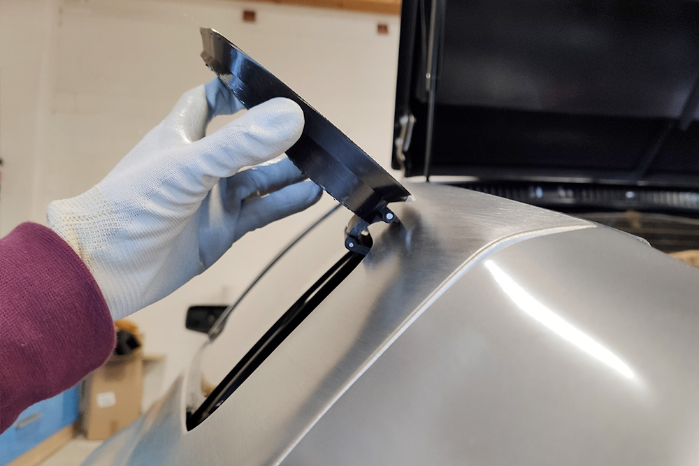 Selbst bei Fahrzeugen, die bereits über eine Tankklappe verfügen, ist die Platzierung der Ladedose nicht immer ganz trivial. Auch beim Jaguar XK 150 konnte die bestehende Tankklappe nicht eins zu eins übernommen werden. Hier war wegen des Verschlussmechanismus und eines recht voluminösen Scharniers zu wenig Platz für die CCS-Dose, und auch insgesamt war die Öffnung etwas zu schmal. Die Öffnung haben wir leicht vergrössert, ein weniger voluminöses Scharnier verbaut, und das Schloss durch einen kleinen Halter ersetzt. Dank eines Magnets schliesst die Klappe sicher.