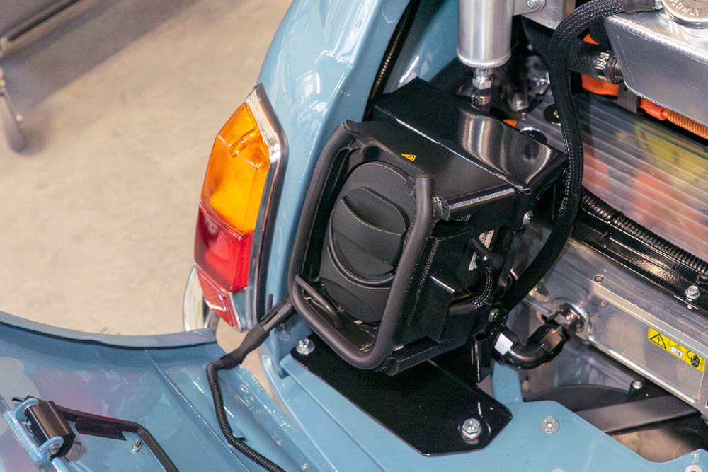 Beim Fiat konnten wir auf keine der bestehenden Öffnungen zurückgreifen. Also musste eine neue Öffnung geschaffen werden. Bei der Suche nach einem passenden Ort spielte unter anderem auch der Gepäckträger eine Rolle. Schliesslich will man nicht jedes Mal den Koffer vom Gepäckträger schnallen, um an die Ladedose zu kommen. Die Wahl fiel auf die Stelle, an der auch original das Logo des Fahrzeugs angebracht ist. Dieses erhält somit gleich eine neue Funktion, es dient nun als Halter zum Öffnen der Klappe.
